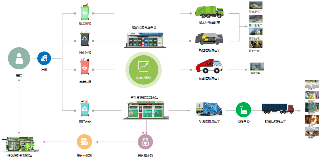 居民、環衛、政府可以通過各個端口的APP對區域內的垃圾分類進行互動、清運回收、監管