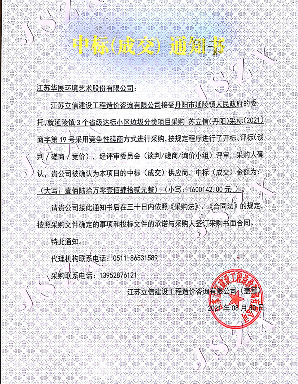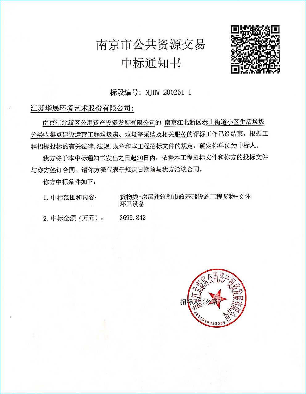 【中標通知】江蘇省南京江北新區泰山街道小區生活垃圾分類收集點建設運營工程垃圾房、垃圾亭采購及相關服務項目